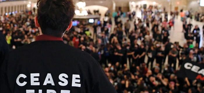 مظاہرین کی جانب سے فلسطینیوں کے خلاف تشدد روکنے اور جنگ بندی کا مطالبہ کیا گیا۔