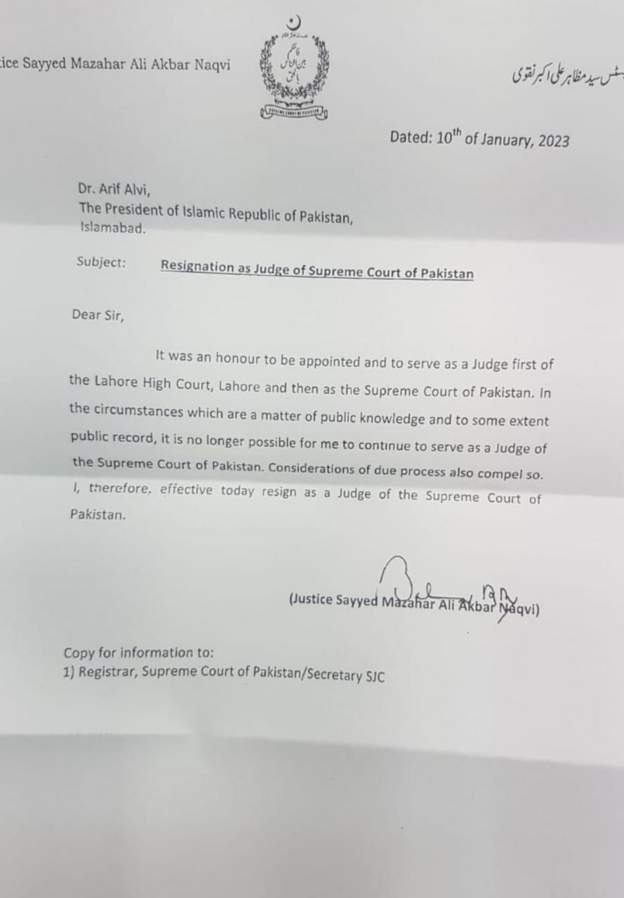 سپریم کورٹ کے جج جسٹس مظاہر نقوی نے اپنے عہدے سے استعفیٰ دے دیا ہے۔ انھوں نے اپنا استعفیٰ صدر مملکت عارف علوی کو بھجوایا ہے۔